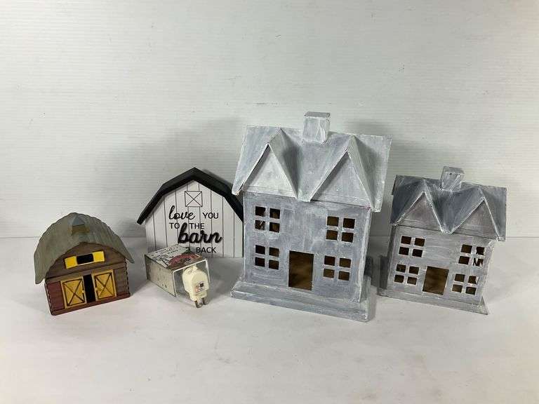 Five-piece collection featuring decorative houses and barns in metal and wood-like materials. Includes two painted barn-shaped pieces, two gray metallic houses with openings, and a miniature milk jug and barn card. Suitable for display or storage use.