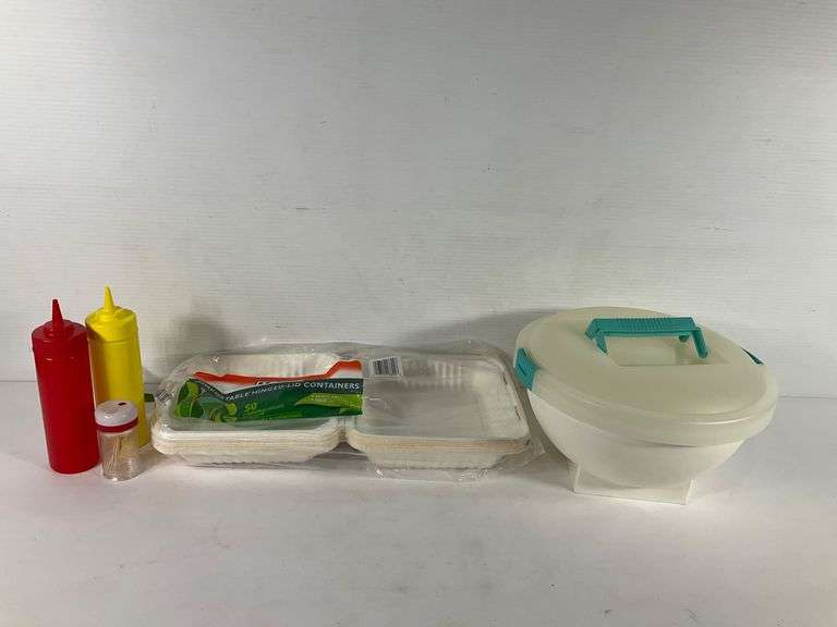 A round plastic container with a locking lid and handle, compostable hinged-lid trays, a yellow and red condiment dispenser, and a small shaker with red lid. Items appear suitable for serving and storing food.