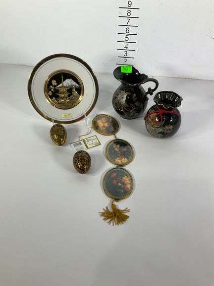 Set features a Chokin Art 24kt gold-etched plate made in Japan, two decorative eggs with floral motifs, a three-pendant Vita Vermont ‘Dutch Floral Collection’ wall plaque, and two black floral pottery vases including Mount Clemens Pottery and an MCI Japan vase with peacock motif.