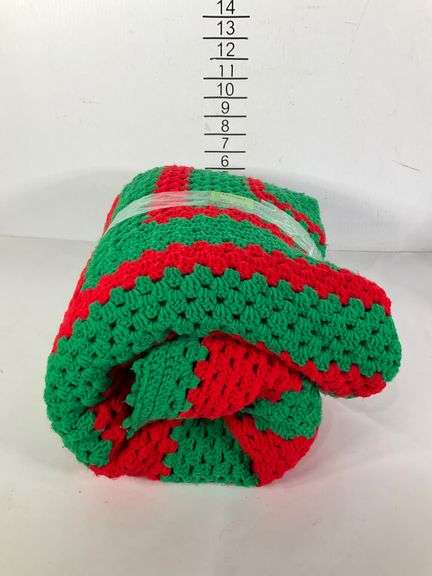 Handmade crocheted throw featuring a vibrant red and green color scheme in alternating striped patterns. Labeled with dimensions 50 x 72 inches. Constructed with a textured, open-knit design.