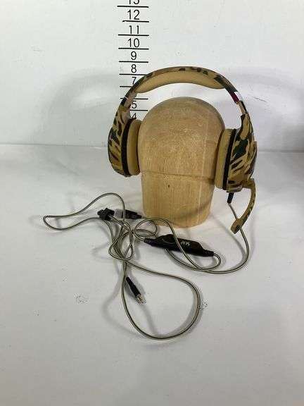 Kotion Each G2600 gaming headset featuring a camouflage design. Includes padded ear cushions, an adjustable headband, a boom microphone, and wired audio connections with an in-line control module. Marked “Kotion Each” and “Model G2600.”