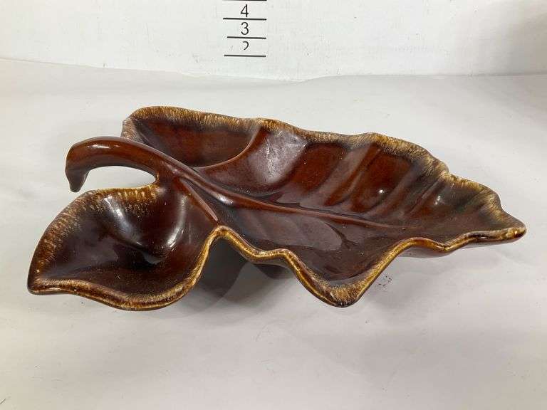 Leaf-shaped ceramic dish marked Hull Pottery USA on the base. Features a glossy brown glaze with textured edges and a curled stem detail. Suitable as a decorative or functional piece.