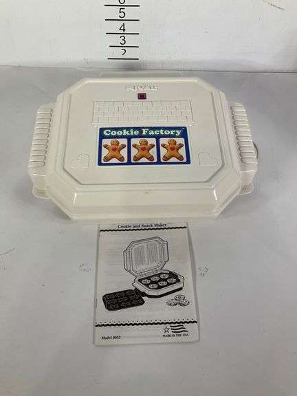 Includes a Rival Cookie Factory Model 9952 electric appliance for making cookies and snacks. Features gingerbread man-shaped molds and comes with the original instruction manual. Powers on, not tested further.