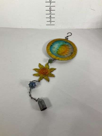 Hanging wind chime featuring a colorful glass sun and moon design, suspended on a metal chain. Includes additional decorative metal and glass elements, ending with a bell-shaped component. Vibrant colors and mixed materials enhance its visual appeal.