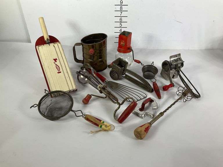 Vintage kitchen utensils and tools, featuring items such as a Popeil Brothers hand grater, a Bromwell sifter, a glass jar grinder with floral design, and various strainers, whisks, slicers, and other utensils. Includes metal and wood components.