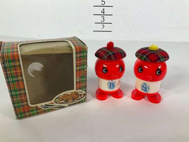 Red plastic salt and pepper shakers by Lucky Clover Toys, featuring tartan-patterned fabric hats and printed blue monograms on white torsos. Includes the original plaid-patterned box marked.