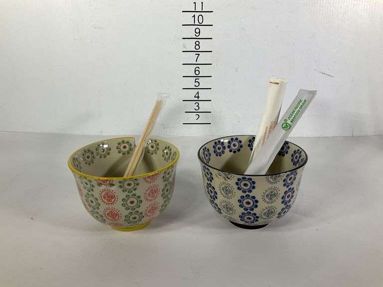 Ramen ceramic bowls featuring vibrant floral patterns on white backgrounds. Includes one with red and green motifs and a yellow rim, and another with blue and black motifs. Both include integrated slots for resting chopsticks. Marked ‘Royal’ and dishwasher- and microwave-safe.