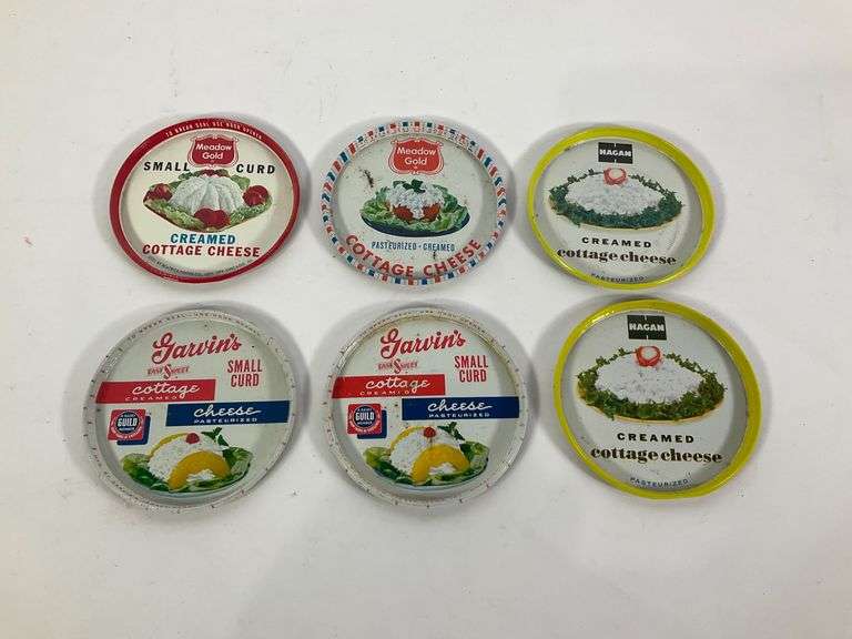 Six tin lids from cottage cheese containers branded Meadow Gold, Garvin’s, and Hagan. Designs feature creamed and small curd text along with colorful branding and imagery. The undersides are plain metal. Some wear is visible on the surfaces.
