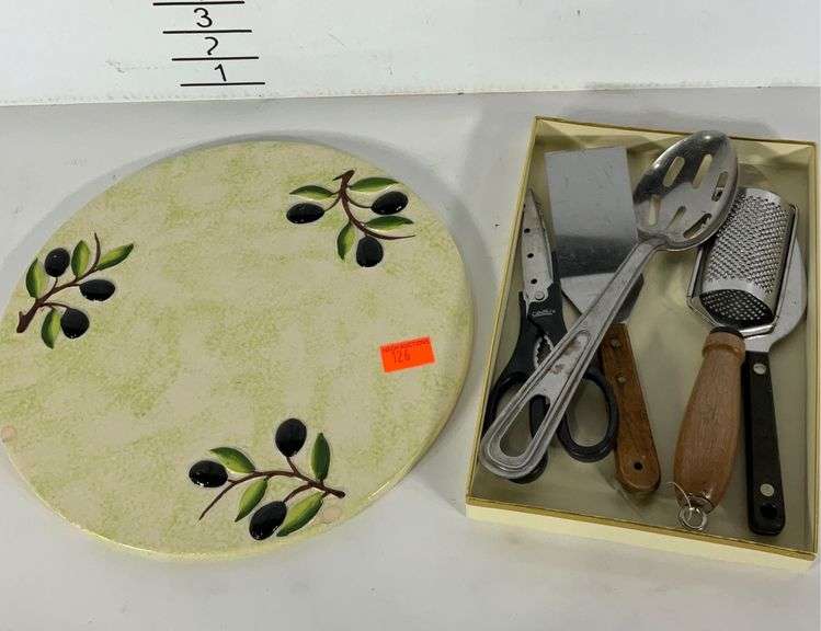 LOT 1730 - Ceramic cake plate(chipped) and kitchen utensils