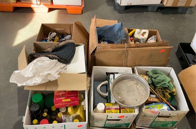 LOT 4511 - Pallet lot: Assorted chemicals, hats and textiles, electric wires, composting bags, paint supplies, etc.