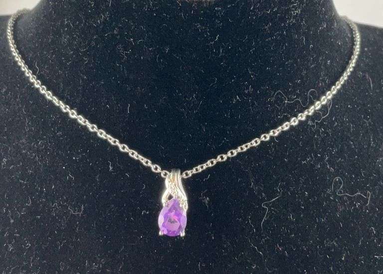 LOT 672 - Sterling silver 1ct pear cut amethyst pendant with 20in stainless chain