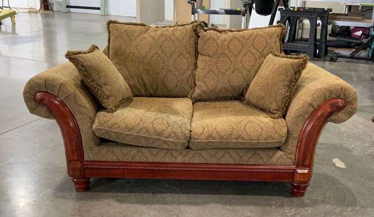 LOT 1539 - Loveseat, pillow cushion type, with two throw pillows,