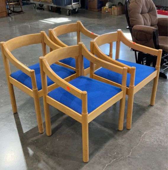 LOT 1549 - Set of 4- Chairs, maple framed with blue upholstery seating, armed lobby style, all in solid usable condition
