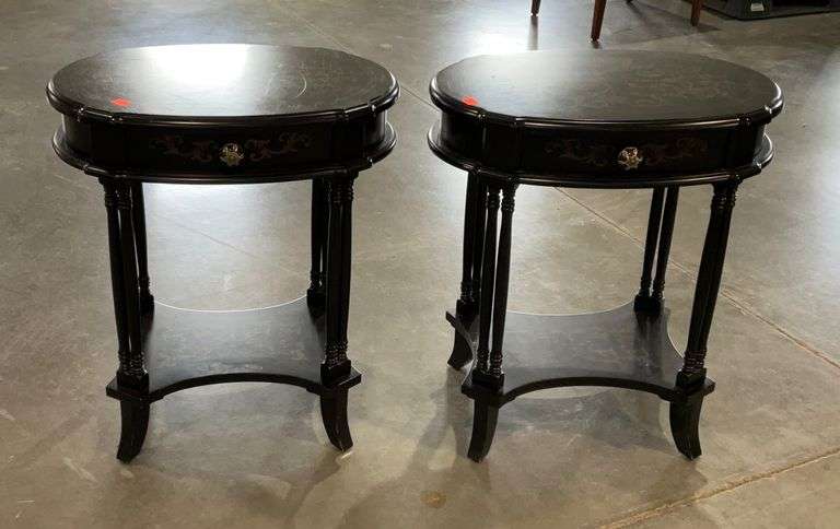 LOT 1637 - Pair of Modern Home Living Room and Stands, 24”, turtle shaped top with drawer, under shelf, and double column corner undercarriage, ebony color finish with stencil type decor, some use as shown sellercode D5